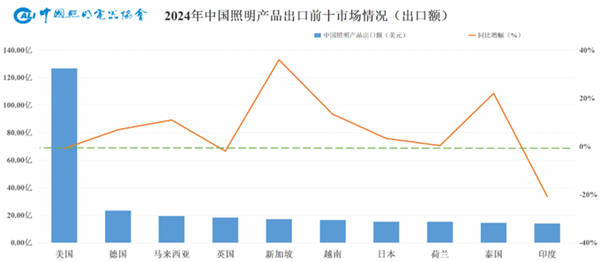 從單一出口目的地來看,2024年我國照明產品出口額排名前十的市場分別是:美國、德國、馬來西亞、英國、新加坡、越南、日本、荷蘭、泰國和印度,出口額整體穩定,約280億美元,同比增長約3%;約占我國照明出口額50%,與上一年基本一致。